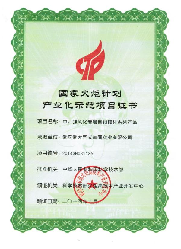 2014年科学技术部“国家火炬计划产业化示范项目证书”