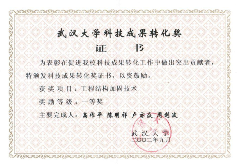 2002年度武汉大学“工程结构加固技术一等奖”