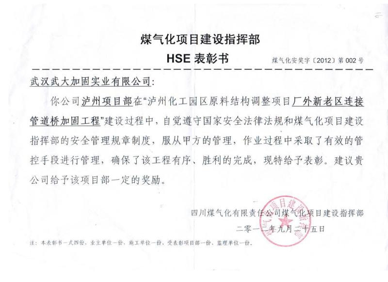 2012年四川煤气化有限责任公司“HSE表彰书”