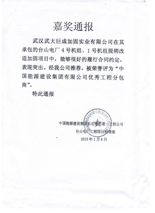 2013年中国能源建设集团有限公司优秀工程分包商