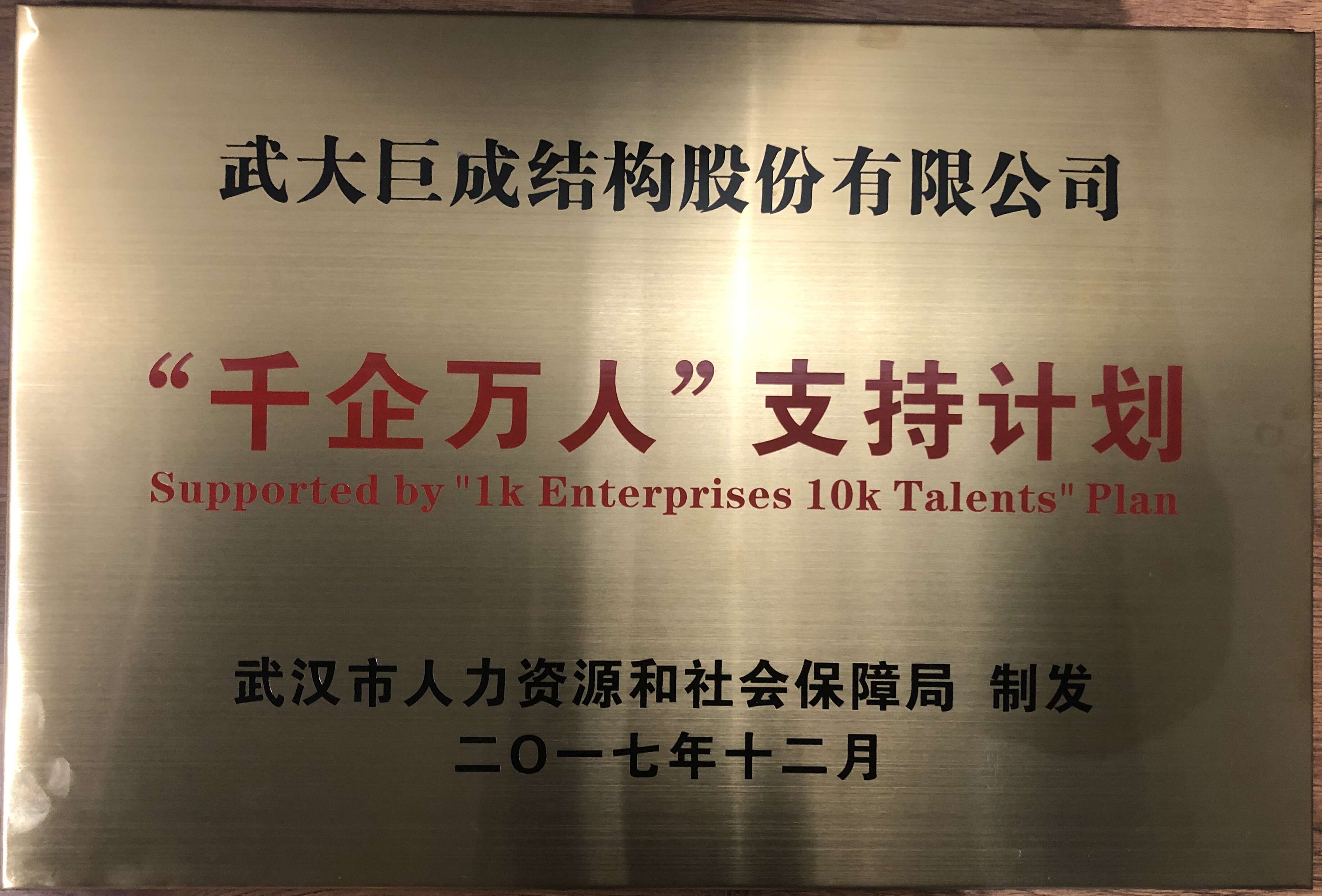 2018年武汉市人力资源和社会保障局授予“千企万人”支持计划