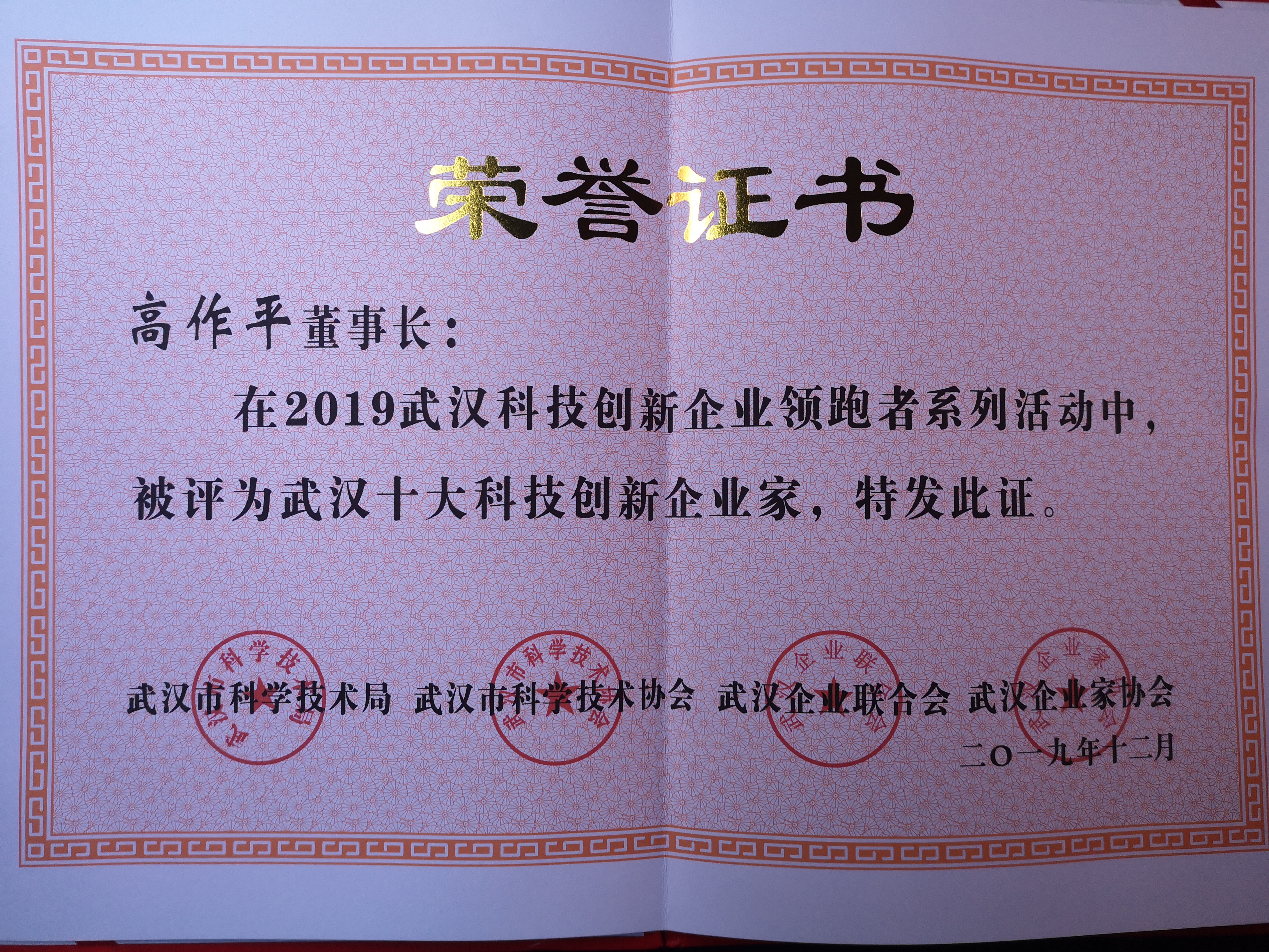 2019武汉十大科技创新企业家证书