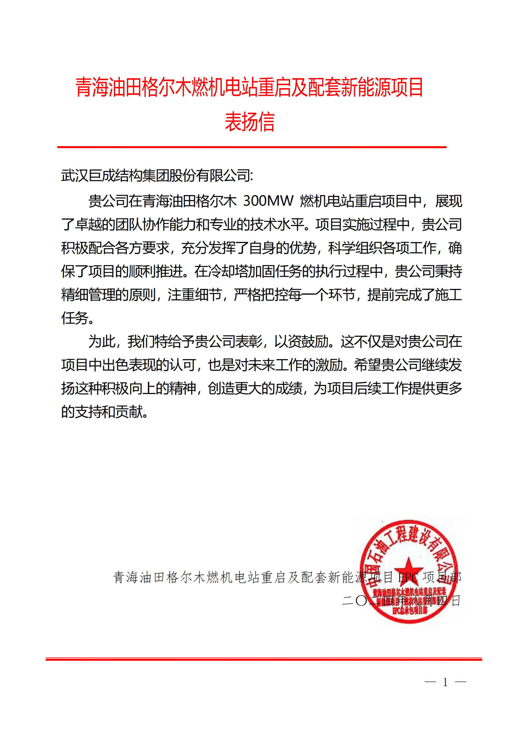 2024年青海油田格尔木冷却塔加固项目 表扬信