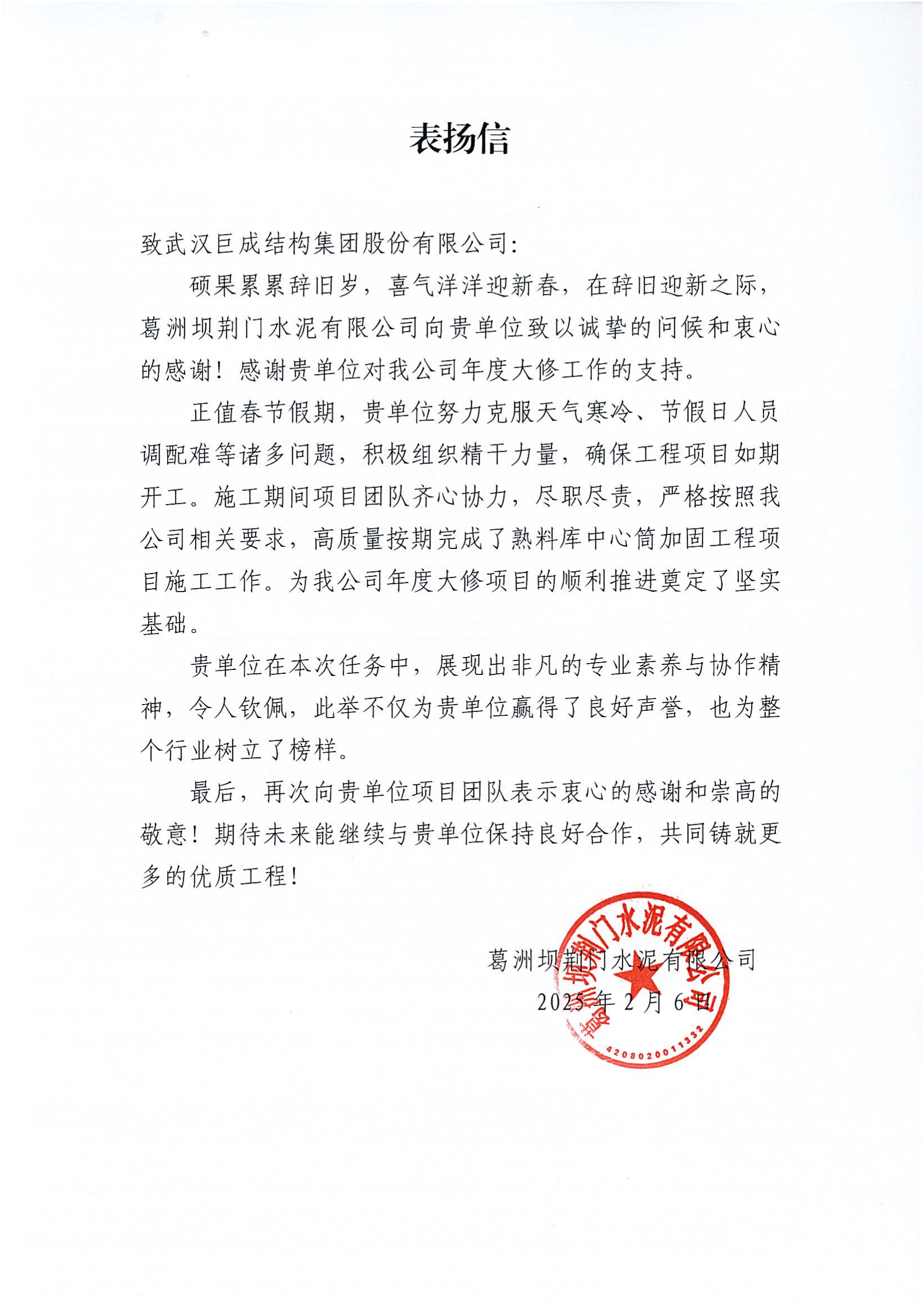 2025年葛洲坝荆门水泥有限公司 表扬信