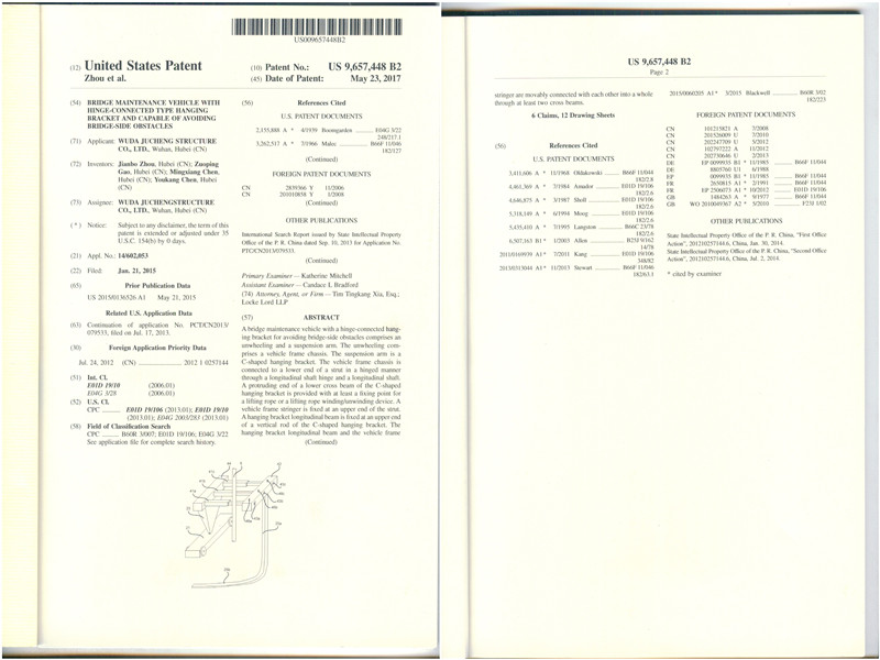 热烈祝贺我公司不封道桥梁检修架车发明专利获美国授权。该专利于2013年通过PCT分别进入美国和欧洲进行专利申请,并于今年获得美国授权。据悉,在欧洲的专利申请也进行到后期答复阶段,相信不久将传来捷报。