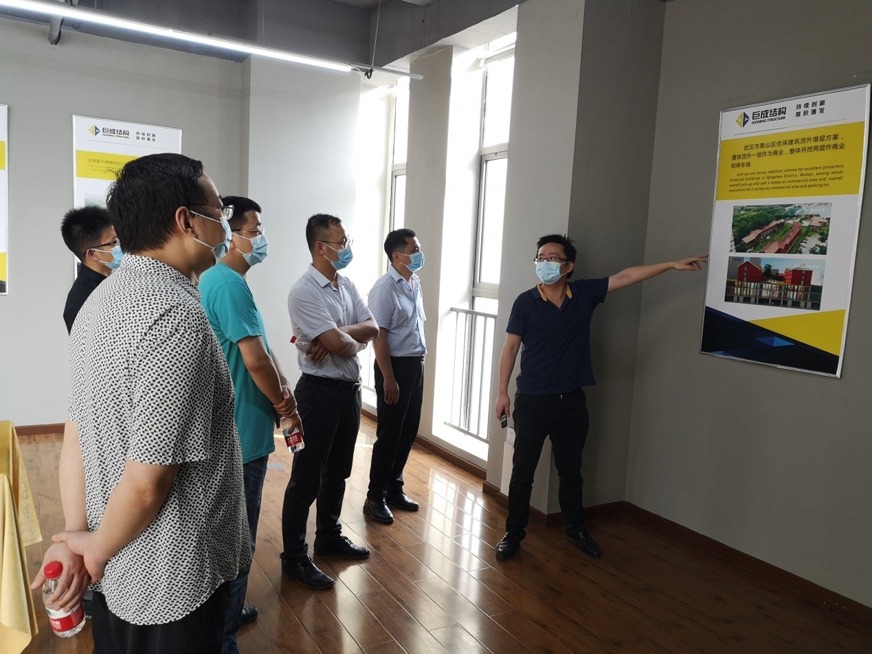 正华设计一行首先参观了必赢bwin线路检测中心公司的顶升试验,试验负责人张畅、周志勇详细介绍了试验的过程和创新之处。随后王总一行参观必赢bwin线路检测中心的展厅,详细了解必赢bwin线路检测中心的发展历程、企业文化、综合实力、创新技术等。