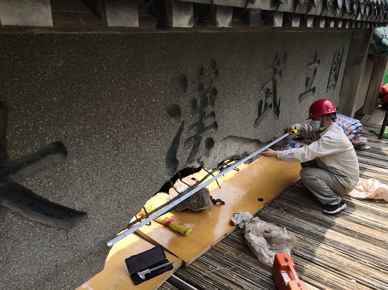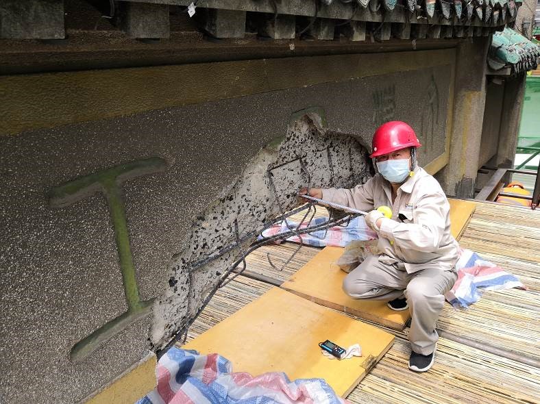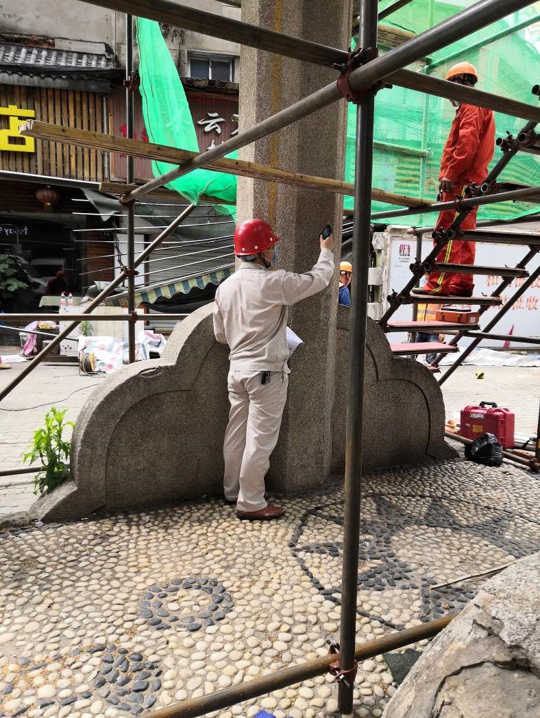 6月12日上午8点,在老牌坊抢险加固项目的施工平台搭建完成后的第一时间,必赢bwin线路检测中心公司现场值守检测人员立即对老牌坊的损伤情况进行了详细的勘查检测工作。包括老牌坊的建筑结构图纸测绘复原,损伤区域的位置、尺寸、影响范围及严重程度的测量评估,结构基体材料强度检测,表面装饰层做法调查,结构整体变形测量等多方面的内容。此次检测工作严格遵守文物保护工程的管理要求,尊重老牌坊作为历史文物的价值,以减少对结构本体的干预为基本原则,各项参数均采用了无损检测的作业方法,并取得了良好的效果。