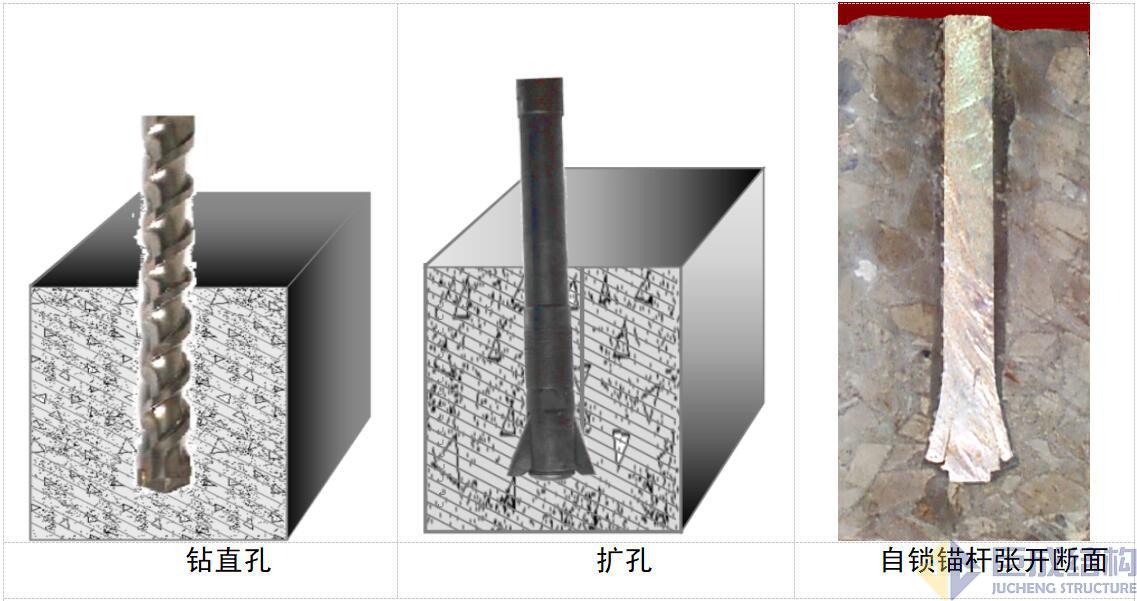 扩孔自锁锚固可以彻底解决上述问题,该技术核心机理是通过底部扩孔形成机械咬合提供锚固力,同时利用注入的高强无收缩水泥基注浆材料对杆体进行保护,并将被锚固体与自锁锚杆粘结成整体,从而形成一个较为完整的自锁锚固体系。