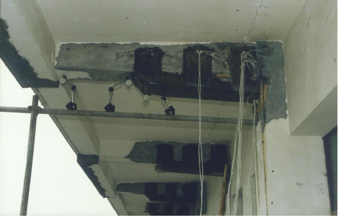 荆州东门小学教学大楼为7层钢筋混凝土框架式结构,悬挑外走廊设计,建筑面积约4000m2,于1996年投入使用,1999年发现外走廊1~7层②~⑩轴悬臂梁根部出现了大量竖向裂缝,80%的裂缝宽度在0.2mm以上,由上至下延伸长度超过梁高度的60%,其中50%以上的裂缝是贯穿性的,悬臂梁截面尺寸绝大部分比设计尺寸小,混凝土强度离散性过大,达不到设计强度‚依据建设部《危险房屋鉴定标准》(CJ13-86)第2∙3条、第2∙4条规定,综合判定该楼悬臂梁部分为危险构件,应停止使用,急待加固处理。